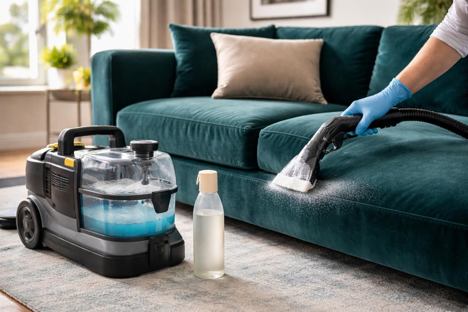 Étapes de nettoyage d’un canapé en velours avec une shampouineuse